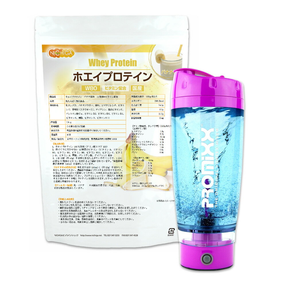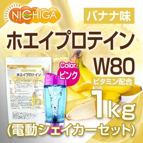 ホエイプロテインW80 バナナ風味 1kg 11種類のビタミン配合 +電動シェーカーセット(ピンク) 【送料無料(沖縄を除く)】 [02] NICHIGA(ニチガ)